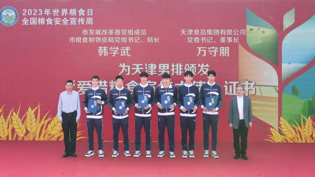 韓學(xué)武、萬(wàn)守朋為天津食品集團(tuán)男排頒發(fā)“愛(ài)惜糧食宣傳大使”證書(shū)。旨在進(jìn)一步宣傳節(jié)約光榮、浪費(fèi)可恥的思想觀念,倡導(dǎo)全民健身活動(dòng),倡導(dǎo)健康文明的新生活方式。