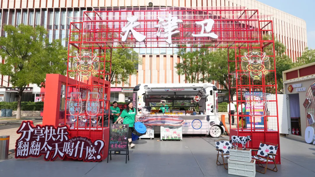 在展位設(shè)計上,結(jié)合天津地方特色,將中國紅與海河花色奶的“多姿多彩”相融合,創(chuàng)設(shè)“天津衛(wèi)”門頭吸引打卡拍照;搭建翻翻墻,市民可根據(jù)不同話題翻看不同產(chǎn)品,充滿趣味互動性。售賣牛奶的牛奶巴士動感十足,將牛奶花紋與“哪吒IP”形象相融合,可愛又富有活力。