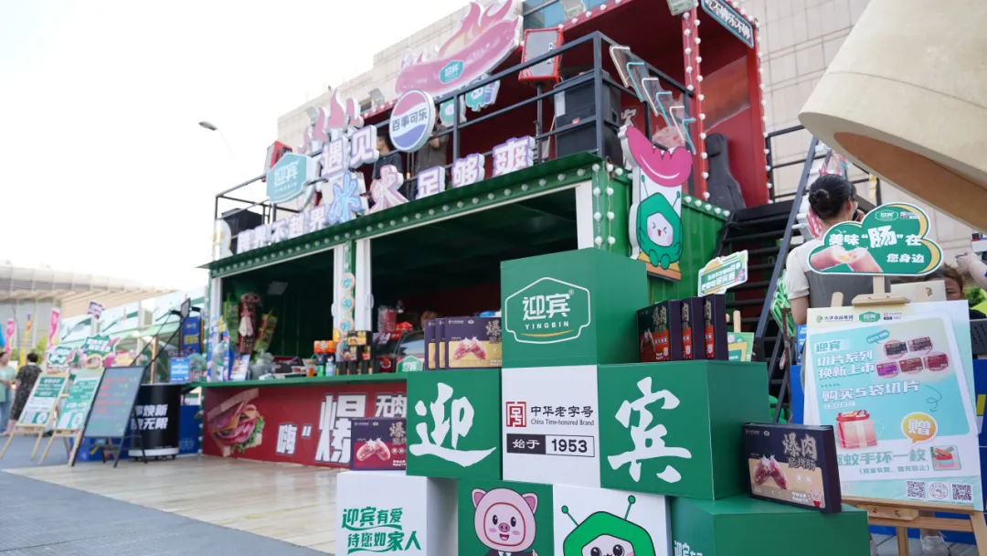 作為市集中的另一大亮點,以紅綠撞色為主體思路,采用現(xiàn)代集裝箱風(fēng)格,頂部設(shè)置“烤腸”造型,與本次市集迎賓的主打新品“爆肉脆烤腸系列”前后呼應(yīng),4種口味滿足大眾味蕾。歌手每日演出精彩不停,讓消費者在音樂中享受美食,游戲區(qū)和休閑區(qū)等多個打卡點吸引消費者眼球。此外,迎賓與百事攜手聯(lián)名打造了跨界不越界的冰火效果,提高了迎賓的品牌知名度,迎賓與百事將以此為契機(jī),穩(wěn)步推進(jìn)深度合作。